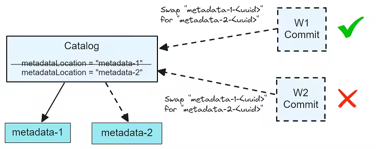 Iceberg 通过原子 CAS 的提交(通过外部的 catalog lock)避免这个问题,W2 提交的时候发现当前 catalog 记录的 snapshot 是 snapshot2了,就会abort 自己,不进行提交,如下所示: