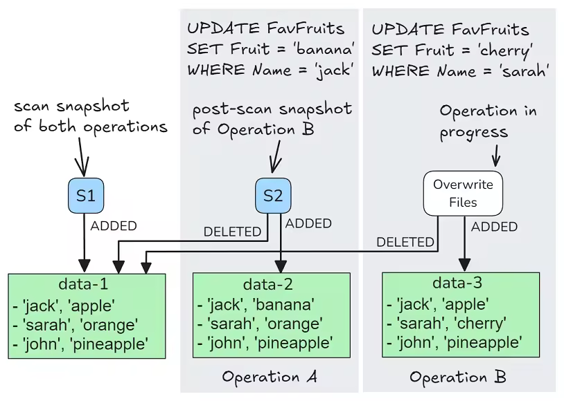 - 两个 Overwrite 操作都将相同的数据文件标记为删除,然后都写了不同的新数据文件,如下图所示: