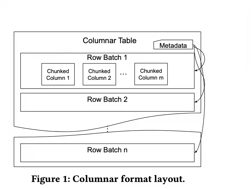 表的所有数据首先被水平切分成若干个 RowBatch,每个RowBatch 包含多行。每个 RowBatch 再按照 列 进行切分成多个 Chunks,每列的数据对应一个 Chunk,Chunk 从第一列到最后一列按顺序摆放。