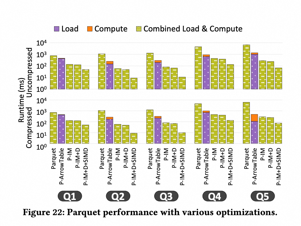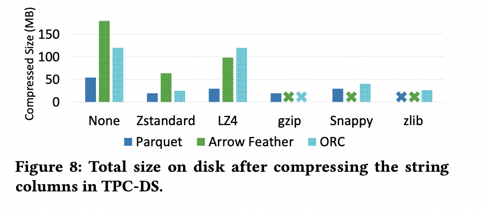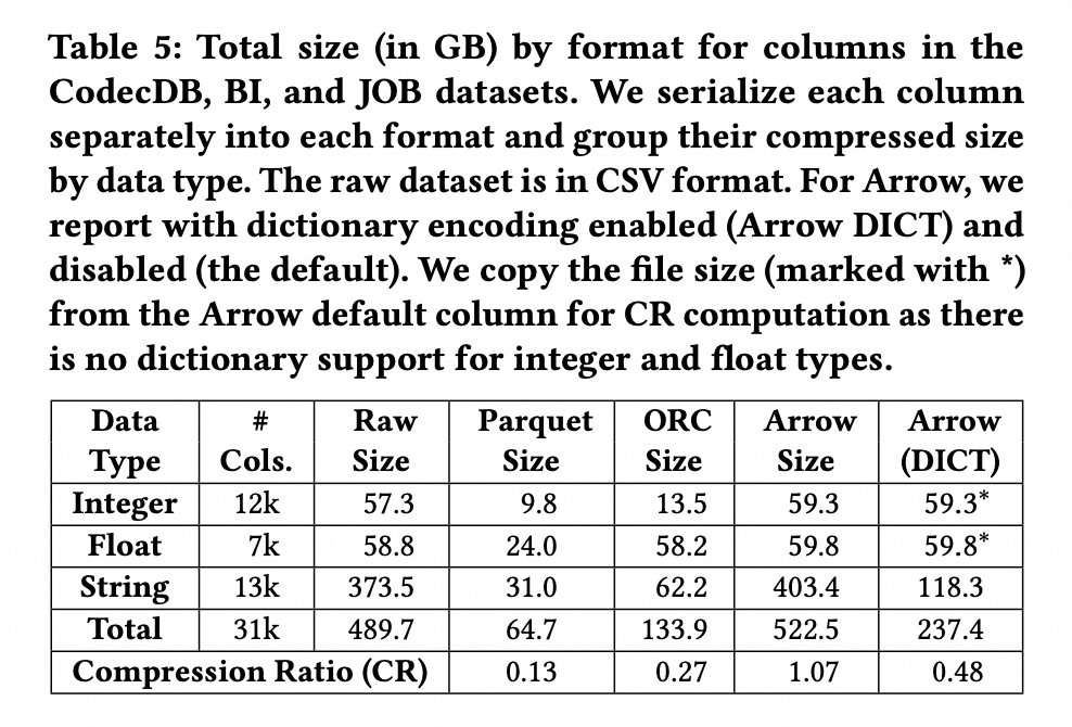 Parquet 和 ORC 压缩后的 size 差不多,但是 Parquet 的 压缩时间比较短,论文认为是因为 Parquet 对 Arrow 有更好的支持,“arrow 和 parquet share same codebase and data structures”