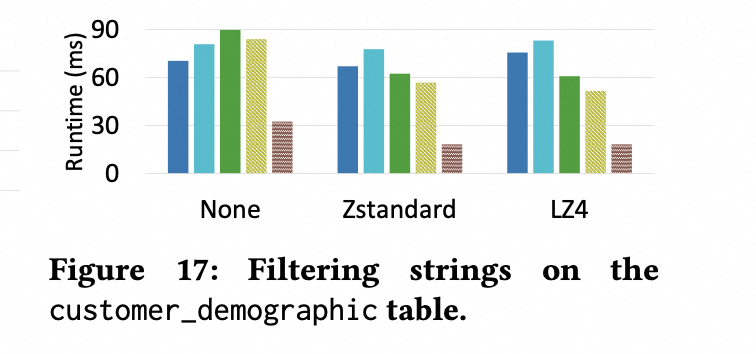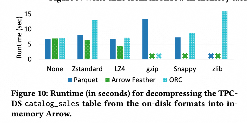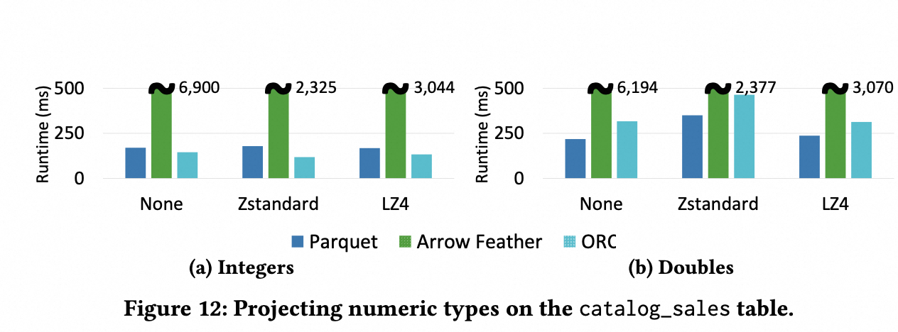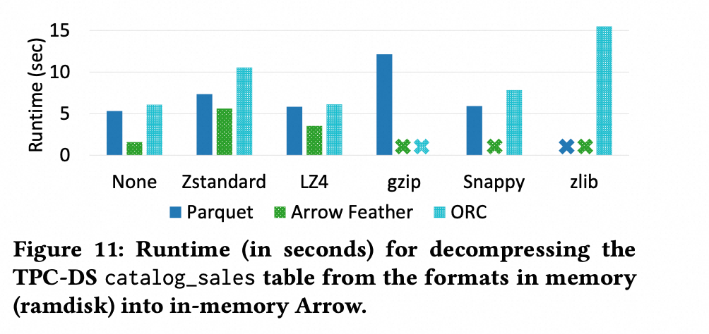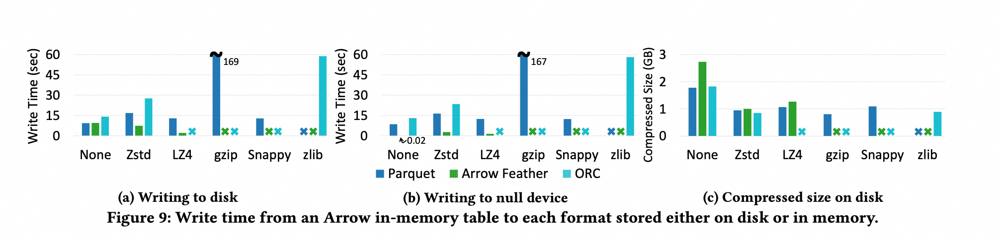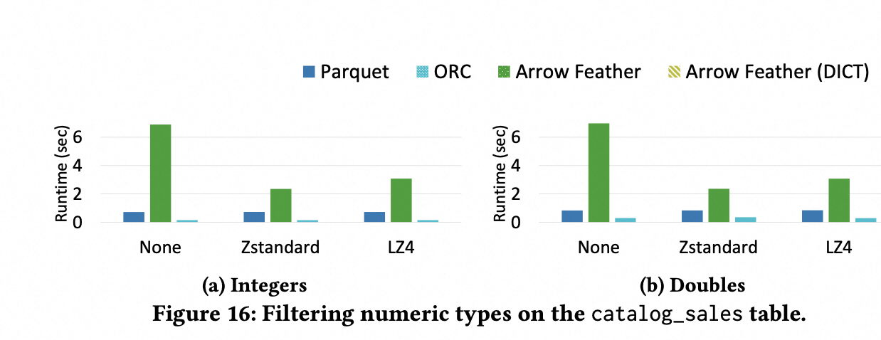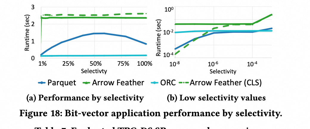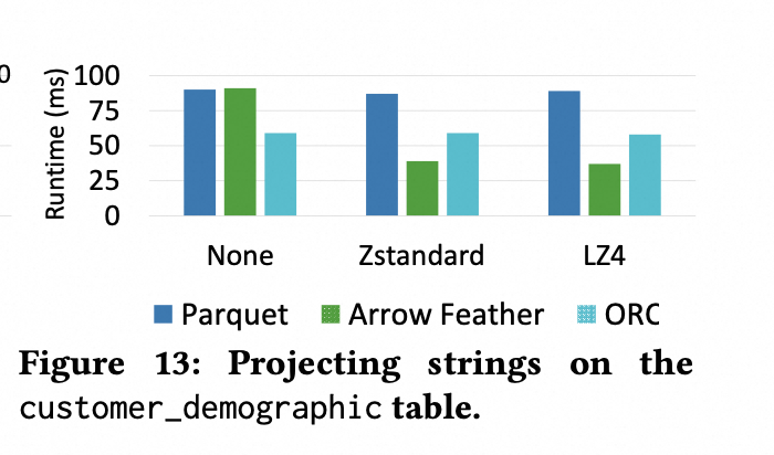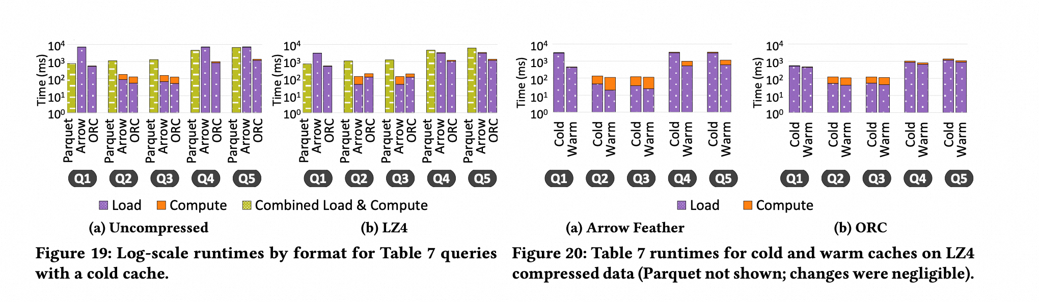 Arrow 总是更快,因为它没有encoding;ORC 最慢,论文认为 ORC 更慢的原因是压缩的配置,比如 block size,buffer size等导致的