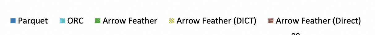 Arrow Feather 性能最好,因为没有 decoding。parquet 性能比 orc 好,因为 orc 需要将一批数据 load 到内存,有额外的 string 的 copy。而 parquet 是流式api,可以避免 load 将被过滤掉的数据到内存。