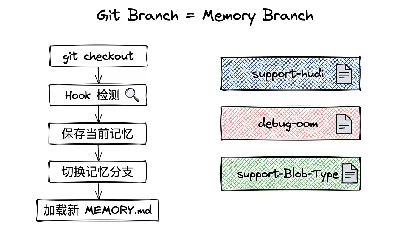 - Hook 自动执行:保存当前记忆 → 创建/切换到对应的记忆分支 → 加载新分支的 MEMORY.md