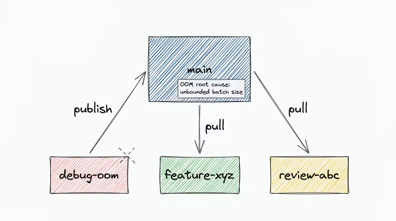 典型场景:排查完一个 OOM 问题后,过程中的"怀疑是缓存泄漏"“可能是连接池"等错误假设留在临时分支里,只把最终结论发布到 main: