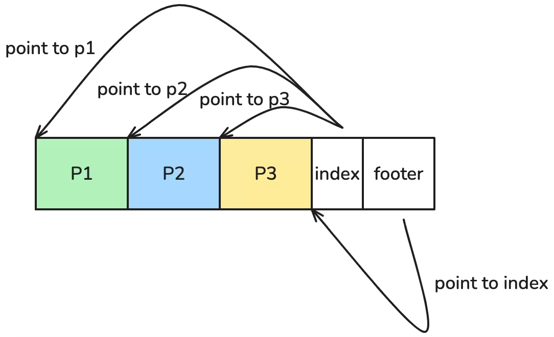 文件末尾有个 footer 来指向 index 的起始位置,然后 index 分别指向 p1,p2,p3 数据所在的起始位置。这样 AutoMQ 如果要读这个文件的某个分区的数据的话,通过 footer 找到 index,然后再通过 index 找到对应的分区。