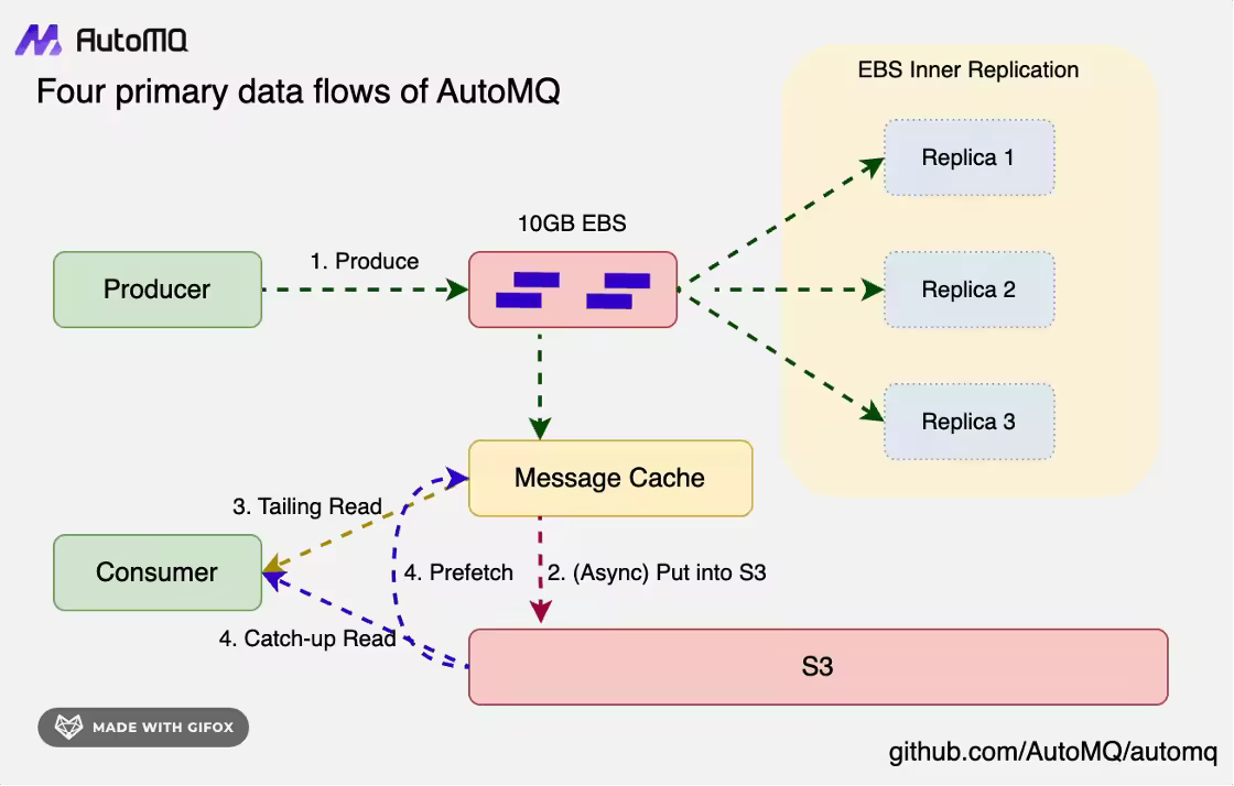 Consumer 在回追数据的场景下,读的那部分数据通常已经在对象存储 S3 当中,broker 会从 S3 中 fetch 数据放到自己的 BlockCache 中,Consumer 然后从 broker 的 BlockCache 中读。考虑到从对象存储 S3 中延迟比较高,AutoMQ 会采用 parallel read,prefetch read,batch read 等技术降低整体延迟。(注:这里图中的步骤4 有点问题,Consumer 并不是直接从 S3 读数据的,最终其实还是从 Broker 的 Message Cache 中读数据)