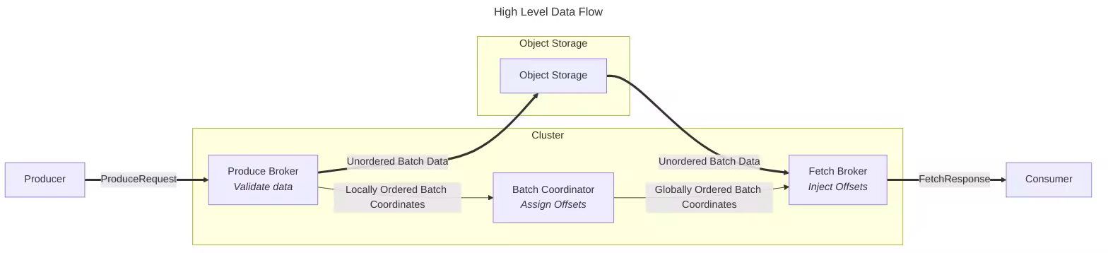 Producer 将数据发送到 Broker,Broker 将数据上传到 Object Storage,然后再通过一个 Batch Coordinator 分配数据对应的 log offset,将数据对应的 metadata 信息,比如在 Object Storage 的哪个文件上,文件 offset 等信息也持久化到 Batch Coordinator中。metadata 信息持久化到了 Batch Coordinator 则认为数据写成功了。