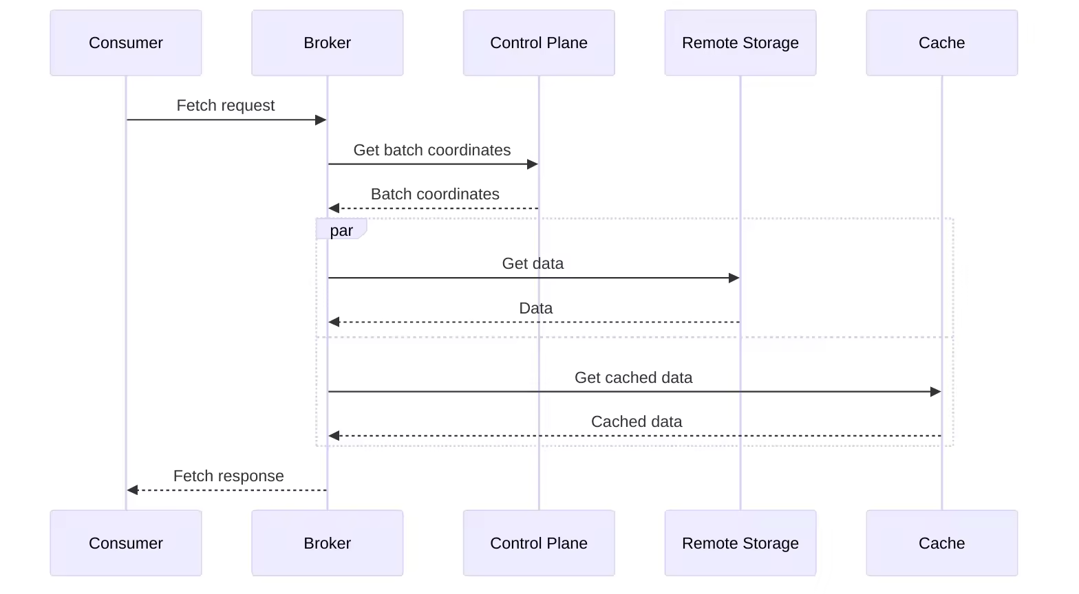 注意:传统 Kafka 中,log offset 信息是记录在数据块(record batch )中的,作为数据块的 header 一部分存储在文件中。但是这个架构下。log offset 信息的 source of truth 是记录在 BatchCoordinator 中的,所以需要消费的时候,需要请求一下 BatchCoordinator 得到 source of truth 的 log offset。