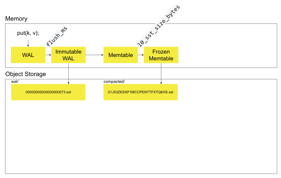 在 flush_ms 后,mutable WAL 变为 immutable WAL,异步写到 object storage中
